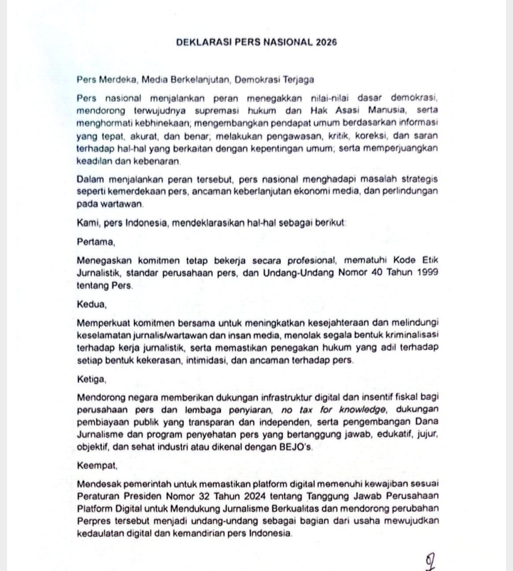 Deklarasi Pers Nasional 2026 ini menjadi penegasan sikap bersama insan pers Indonesia dalam menjaga kualitas jurnalisme, kemandirian media, serta keberlangsungan demokrasi di era digital.