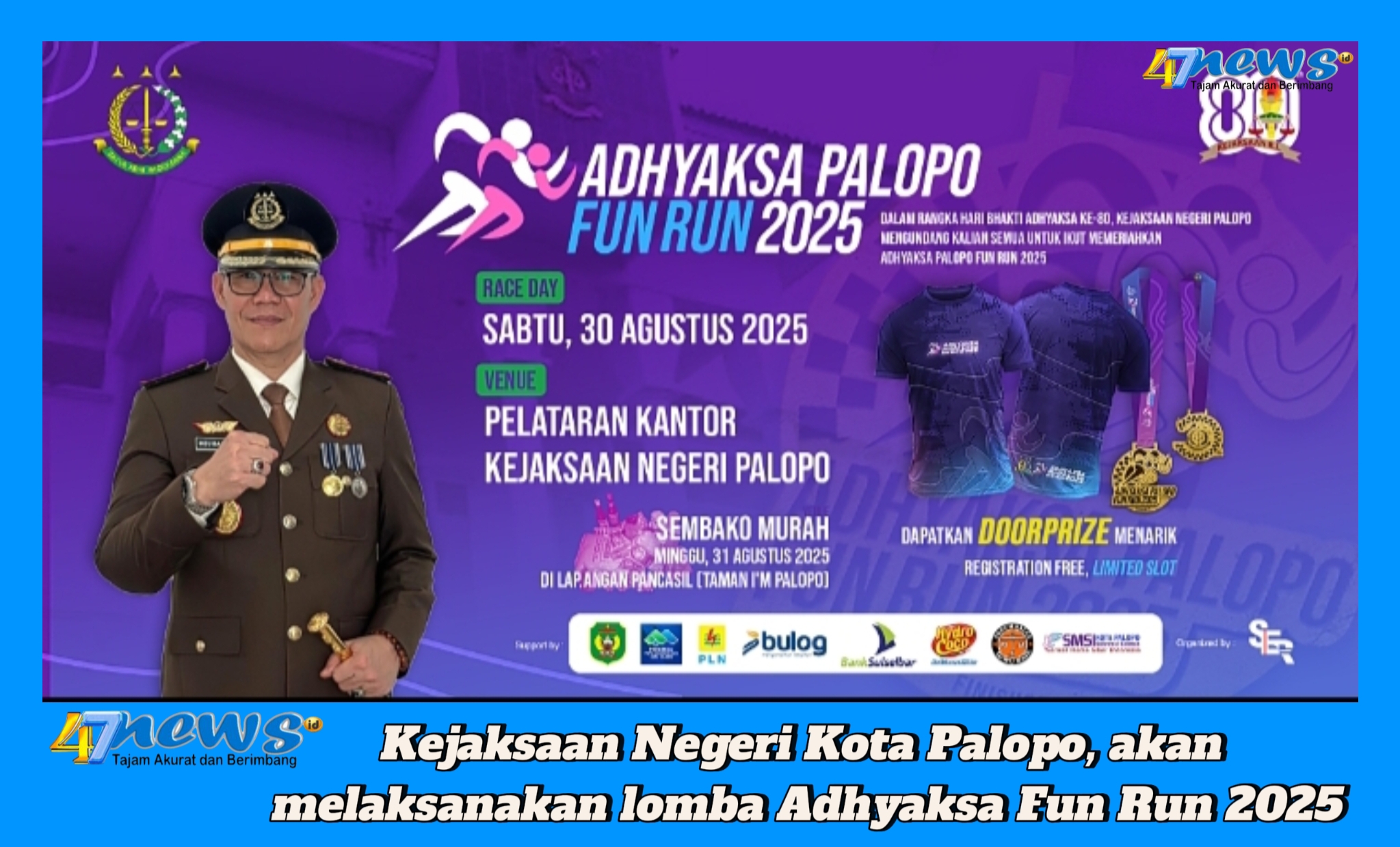 47News.id | Palopo – Kejaksaan Negeri Kota Palopo, akan melaksanakan lomba Adhyaksa Fun Run 2025, dalam rangka Hari Bhakti Adhyaksa ke-80. Kegiatan tersebut berlangsung pada hari Sabtu, 30 Agustus 2025 mendatang, di halaman kantor Kejari Palopo.