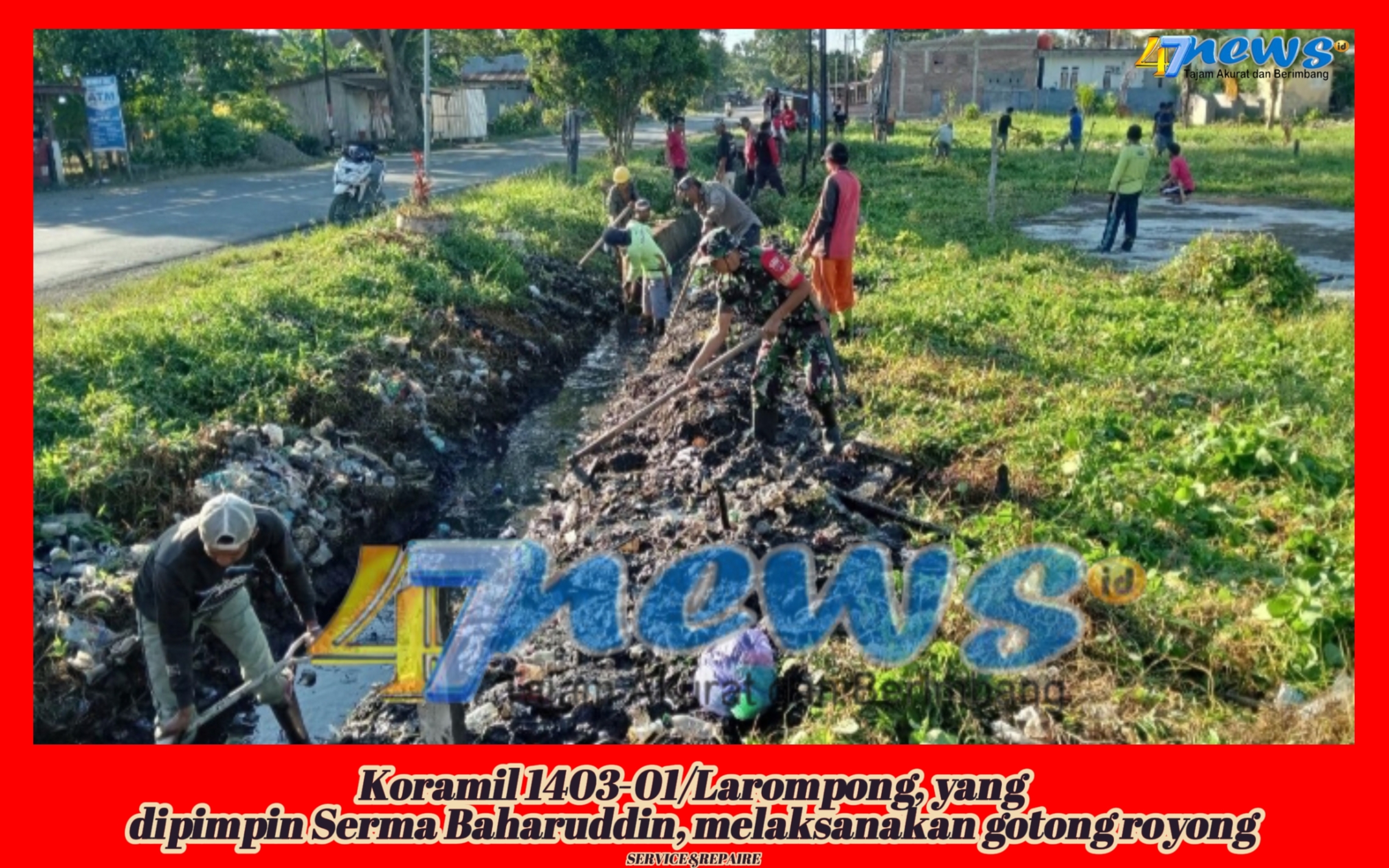 47News.id | Larompong – Personel Koramil 1403-01/Larompong dipimpin Serma Baharuddin, melaksanakan gotong royong bersama warga untuk pembersihan saluran air. Jum’at, 10 Oktober 2025, di Desa Babang Kec. Larompong Selatan, Kab. Luwu.