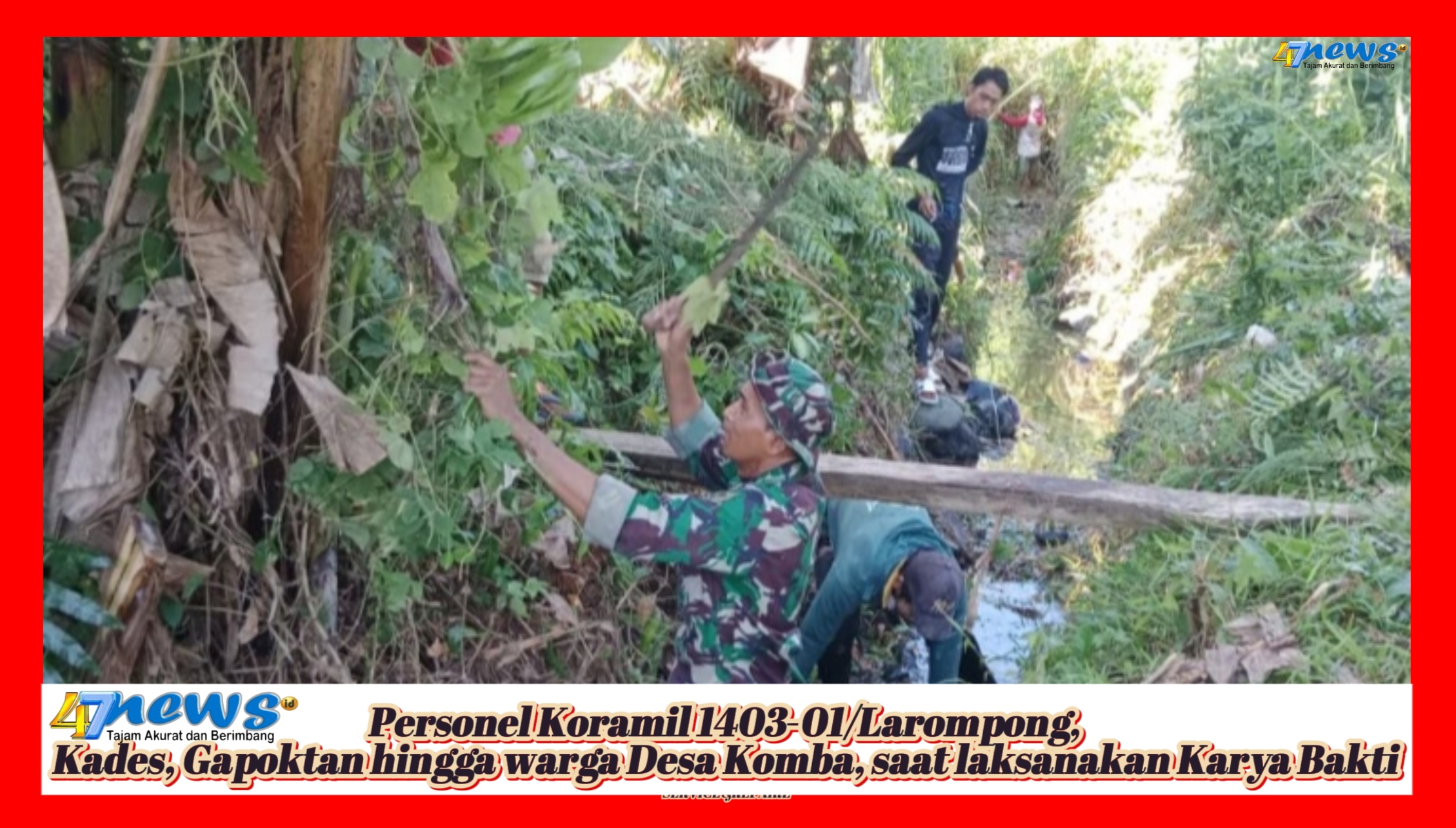 47News. Id | Luwu – Personel Koramil 1403-01/Larompong yang dipimpin langsung Serka Kamiluddin, melaksanakan Karya Bakti pembersihan saluran irigasi. Senin, 3 November 2025, di Desa Komba, Kecamatan Larompong, Kabupaten Luwu.