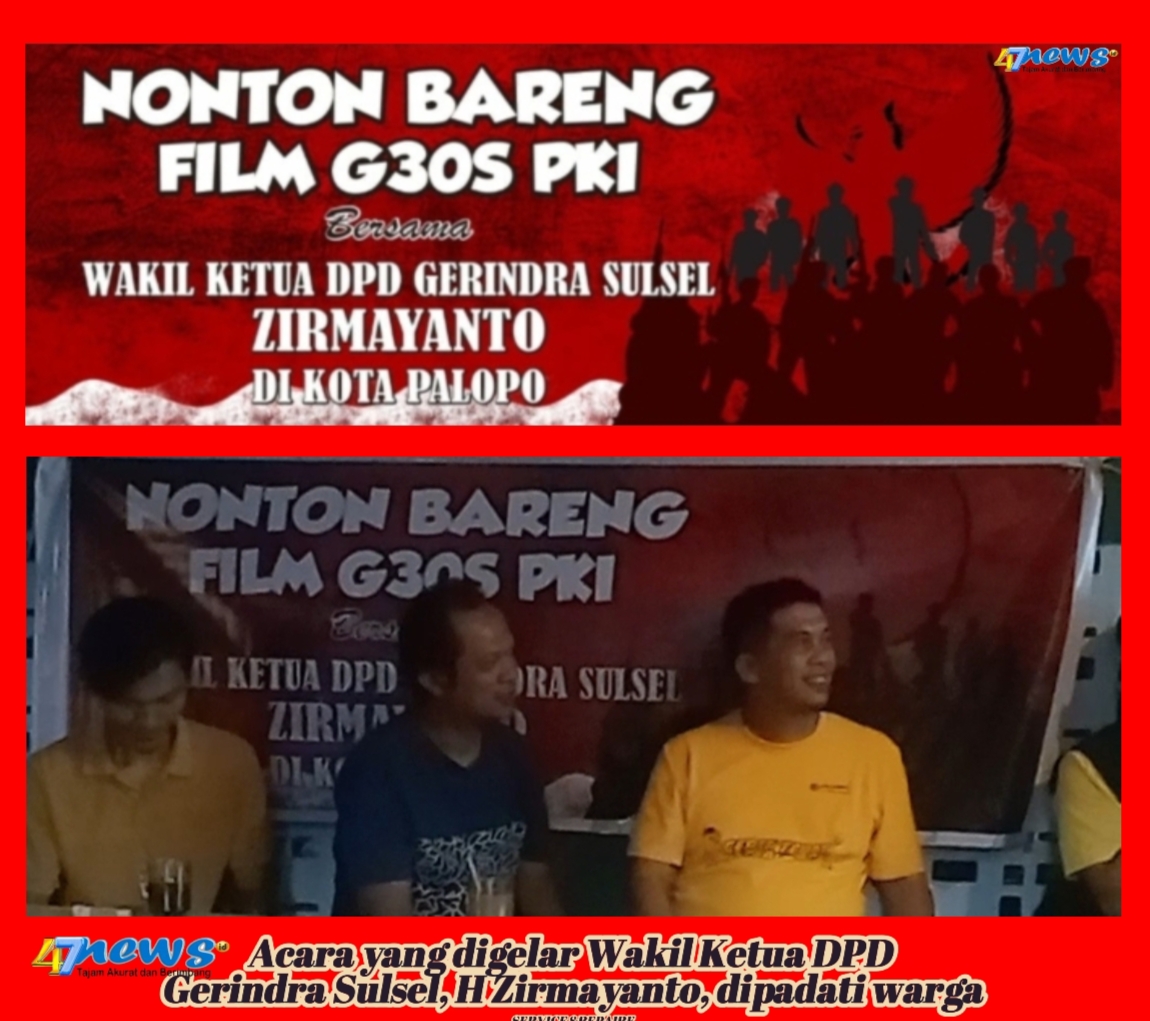 47News.id | Palopo – Wakil Ketua DPD Gerindra Sulsel, H Zirmayanto, ajak masyarakat nobar (nonton bareng) Film Gerakan 30 September G30S PKI di Warkop Labucai, Jalan Djufri Tambora, Ex. Malaja 2, Kelurahan Surutanga, Kecamatan Wara Timur, Kota Palopo, Sulsel.