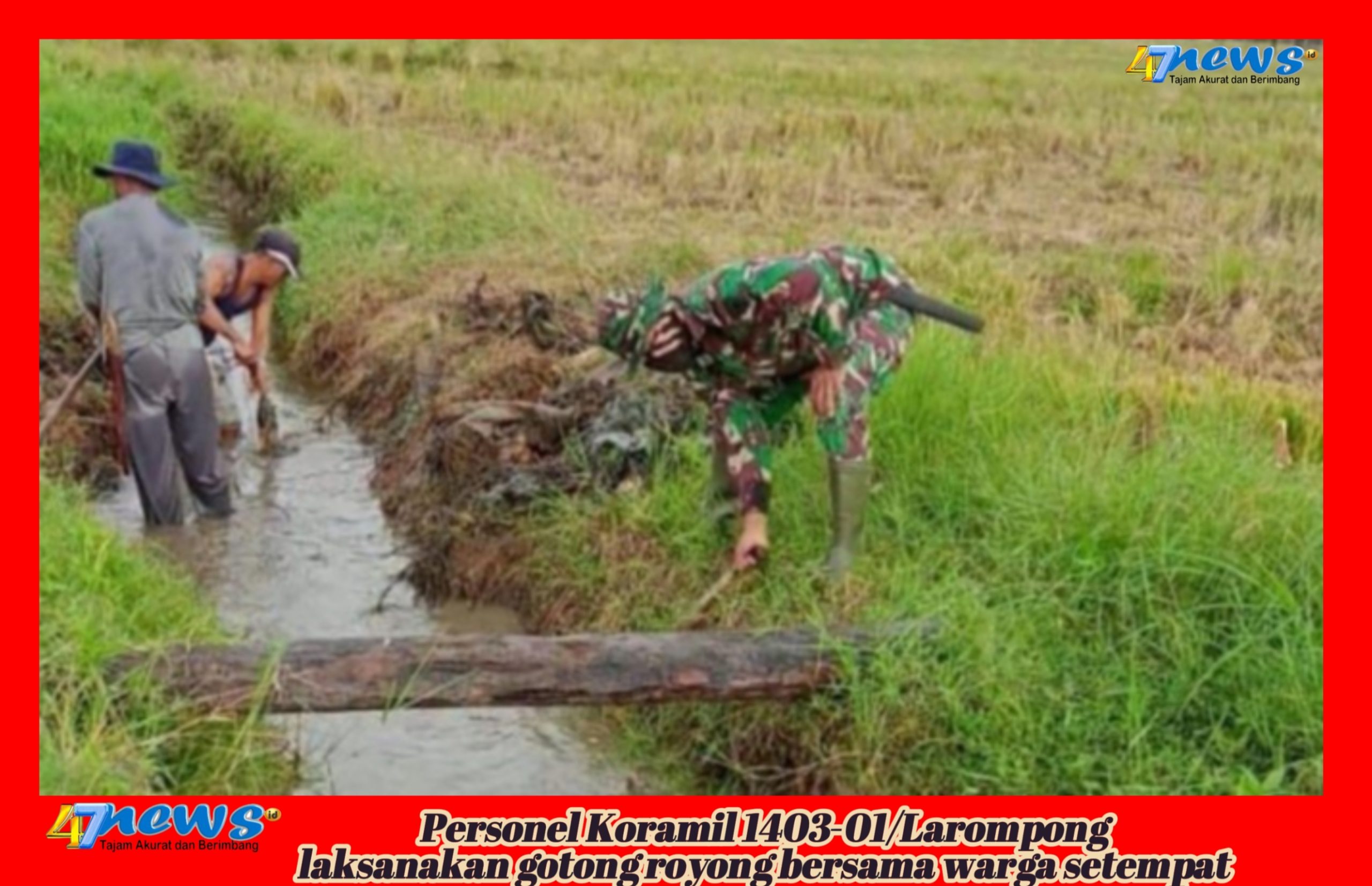 47News.id | Larompong – Personel Koramil 1403-01/Larompong dipimpin Serma Irwan melaksanakan gotong royong bersama warga untuk pembersihan saluran air. Senin, 1 September 2025, di Desa Riwang, Kecamatan Larompong, Kabupaten Luwu.